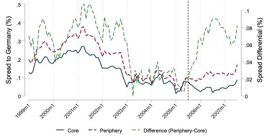 The shift to rating-based eligibility reshaped yield spreads across the euro area. Empirical evidence suggests that the ECB’s new collateral rules, more than economic fundamentals, triggered the reemergence of sovereign spreads in the euro area (Schuster 2023, see also van ‘t Klooster, 2023, Antonini and Mazzocchi, 2025). Post-2005, the ECB’s shift to conditional collateral eligibility signalled that the central bank would allow government defaults, fundamentally changing market perceptions. Markets began pricing a ‘periphery premium’ for countries whose asynchronous business cycles made them more vulnerable to financing constraints under this new conditional framework, even in the absence of weaker fiscal fundamentals. The resulting increase in borrowing costs was substantial: the periphery – relative to the core – experienced spreads rising by up to 20 basis points, effectively doubling yield differentials pre-2005 (Figure 1).