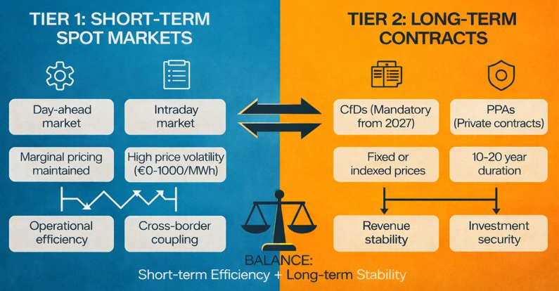 Maintenance of spot marginalism: Very short-term markets (day-ahead and intraday) retain the marginal price principle, which is considered essential for operational efficiency and cross-border electricity coupling. The argument for maintaining this system is that other methods (in particular pricing based on average costs) would have created inefficiencies or opacity[4].